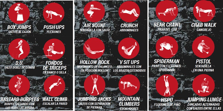 5. EMOM (every minute on a minute). Se realiza en intervalos de 1 minuto. Hay que hacer el ejercicio señalado en un minuto y el tiempo que sobra hasta el minuto siguiente es de descanso. El tiempo total del EMOM será de 20 minutos como máximo.