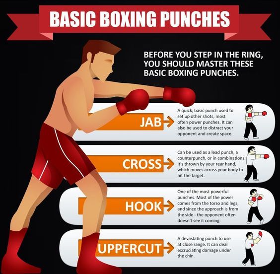 – Jab: puñetazo veloz y directo, lanzado con la mano delantera desde la posición de guardia. Se acompaña de una pequeña rotación del torso y cadera.