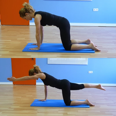 Movimiento: Al espirar, elevar un brazo y pierna contraria. Al inspirar, apoyar brazo y pierna.