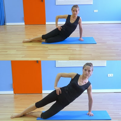 Posición inicial: Sentado sobre un lado, con las piernas flexionas y hacia ese lado. El pie de arriba por delante. Una mano apoyada en el suelo por debajo del hombro y la otra apoyada en la cadera.