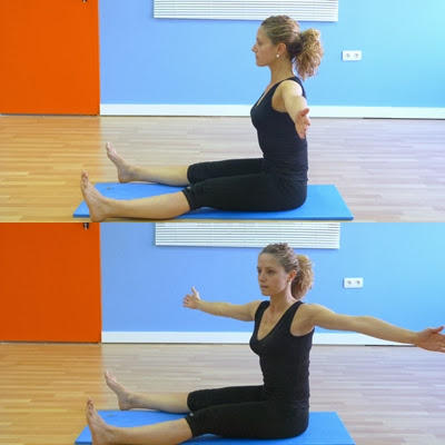 Posición inicial: Sentado en el suelo sobre los isquiones. Piernas extendidas separadas un poco más del ancho de los hombros. Brazos en cruz a la altura de los hombros con las palmas mirando al frente.