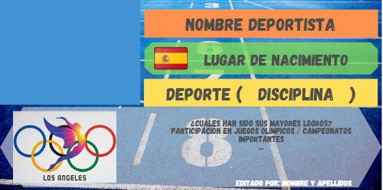Os dejo el modelo de «cromo» que vamos a seguir con foto del deportista, nombre y apellidos, bandera del país y lugar de nacimiento, el Deporte Olímpico que practica y los logros que ha conseguido.